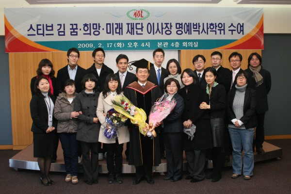 스티브김 동문의 가족이 참석한 가운데 유시찬 이사장, 손병두 총장, 송영만 총동문회 부회장, 이우용 재단이사, 신숙원 재단이사, 전주희 상임이사, 류장선 전 총장, 최운열 부총장, 서정목 문학부 학장, 전성빈 경영대학장 등 교내외 관계자 100여 명이 명예박사 학위를 축하하기 위해 모였습니다.